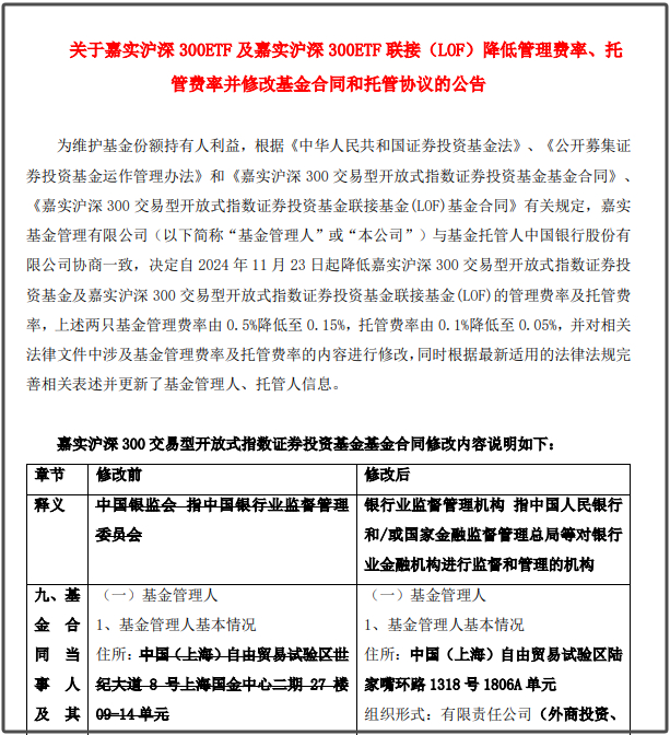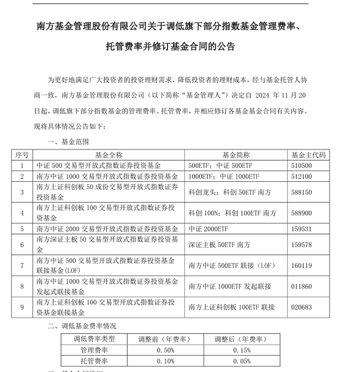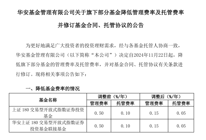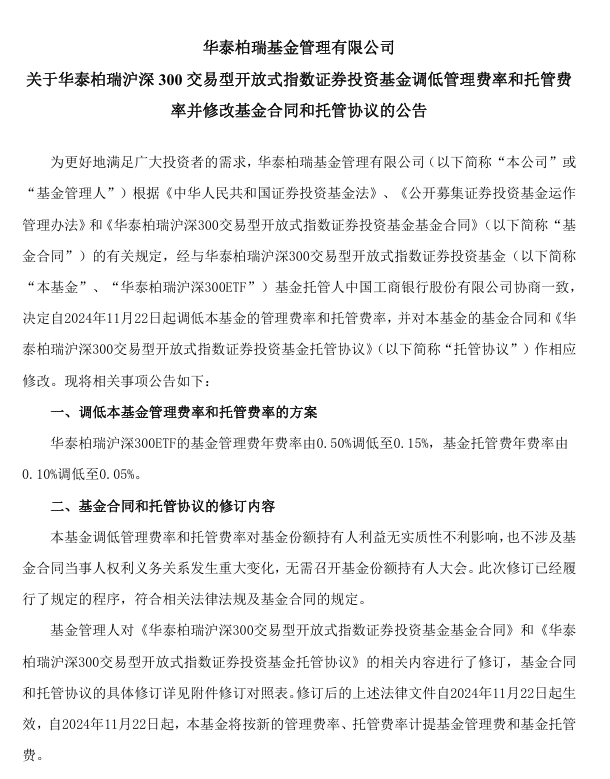 11月19日晚间,华夏、华泰柏瑞、易方达、嘉实、南方、华安等多家基金管理人官网公告,将调降旗下大型宽基ETF管理费率、托管费率。其中,管理费率统一调降至0.15%,托管费率统一调降至0.05%。