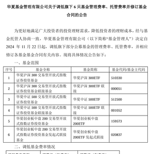 11月19日,华夏、华泰柏瑞、易方达等多家基金管理人官网公告,将调降旗下大型宽基ETF费率,管理费率统一调降至0.15%,托管费率统一调降至0.05%。