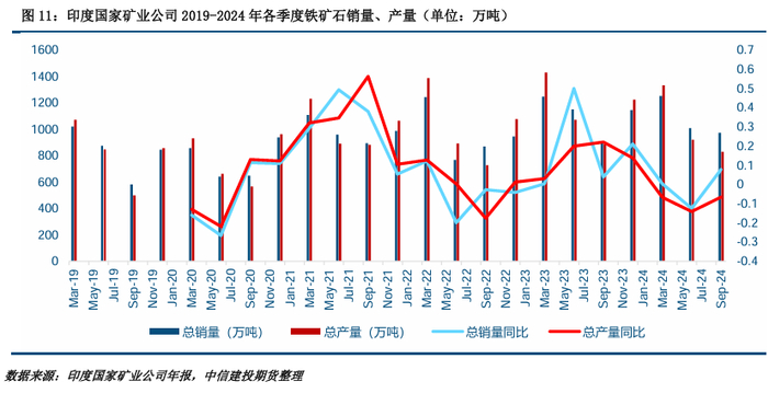 2023-2024年,印度铁矿石产量同比增长约7%,产量从去年的2.57亿吨增加到2.75亿吨,其中NMDC产量突破了4500万吨,占印度16%的市场份额。2023-2024年NMDC取得有史以来最好的年度实物业绩,生产了4502万吨铁矿石,平均品位为64.6%,销售了4448万吨铁矿石。与23财年相比,该公司的产量增长了10%,销售额增长了16%。在24财年获得了21,294千万卢比的收入,比23财年产生的收入增长了21%。在24财年NMDC的EBITDA为8,709亿卢比,比上一财年增长28%。该公司的营业利润率为34%,运营效率较23财年上升了6%。