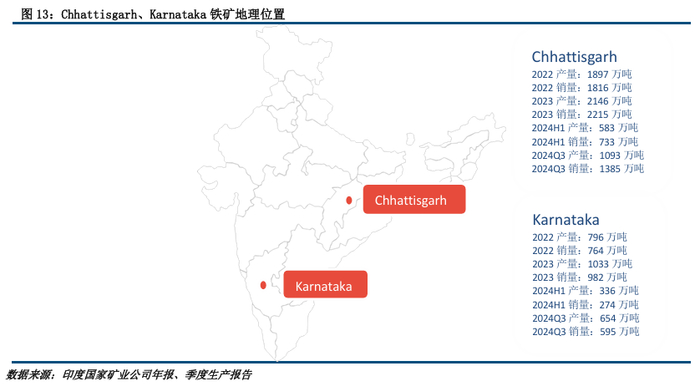NMDC公司在恰蒂斯加尔邦有五个铁矿石租约,在卡纳塔克邦有两个铁矿石租约。