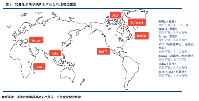 安赛乐米塔尔集团在多个国家和地区涉足铁矿石的挖掘与生产活动,在全球拥有9个运营单位和正在运营和开发的矿山,是世界上最大的铁矿石生产商之一。安赛乐米塔尔的大部分原材料来自自己的矿山和设施,在加拿大、墨西哥、南美、欧洲、非洲、乌克兰、印度等地拥有铁矿石生产设施。