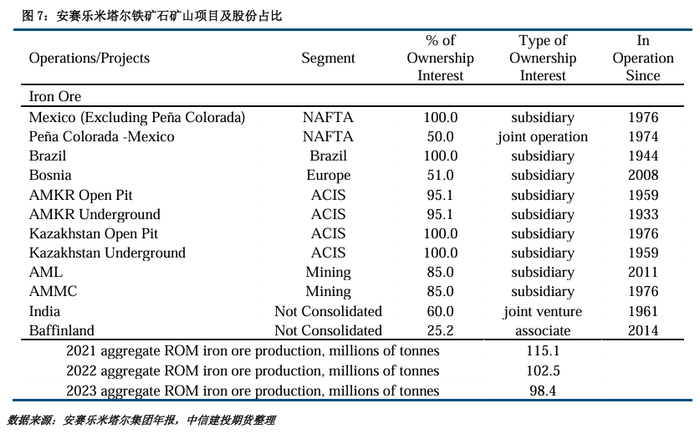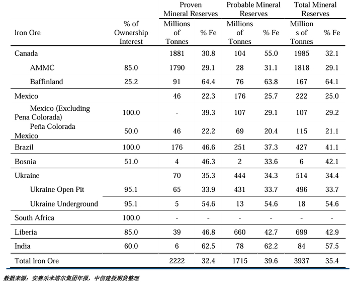 安赛乐米塔尔拥有某些采矿业务不到100%的股权,下表总结了截至2023年12月31日财政年度结束时,安赛乐米塔尔的矿产储量总量,按商品和国家,以及占安赛乐米塔尔总矿产储量10%以上的每个物业。