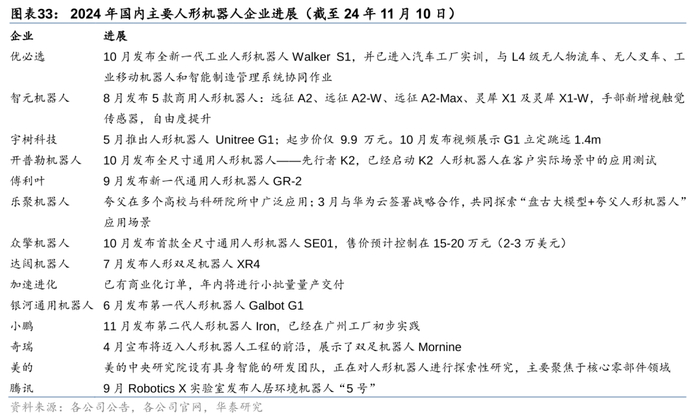 软硬件加快升级,多方企业加码入场。今年国内头部人形机器人企业的主要变化仍然聚焦于产品力与工业场景测试能力,相较于海外企业,智能化提升程度相对薄弱一些。今年部分企业推出低配版低价产品面向市场,率先迈向商业化。除专门做人形机器人的企业外,也频频出现车企、互联网科技企业等。11月15日,华为(深圳)全球具身智能产业创新中心宣布正式运营,与乐聚机器人等企业签署战略合作备忘录,有望共同打造世界级具身智能产业创新中心。我们看好国内人形机器人产品加速量产落地为供应链环节带来更大的市场潜力。