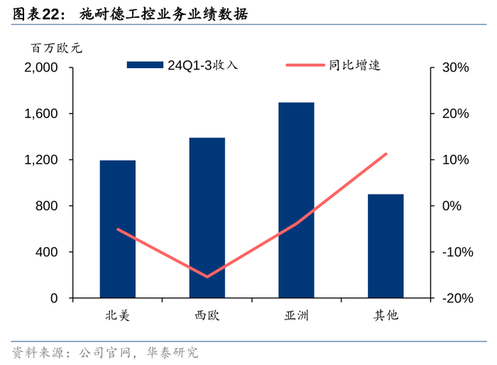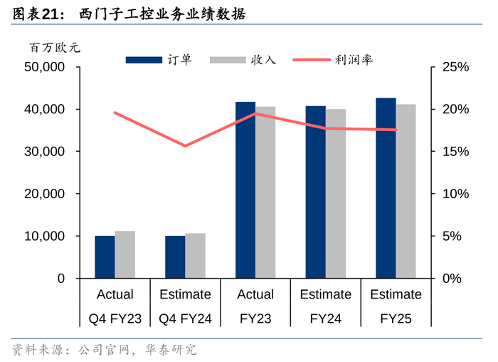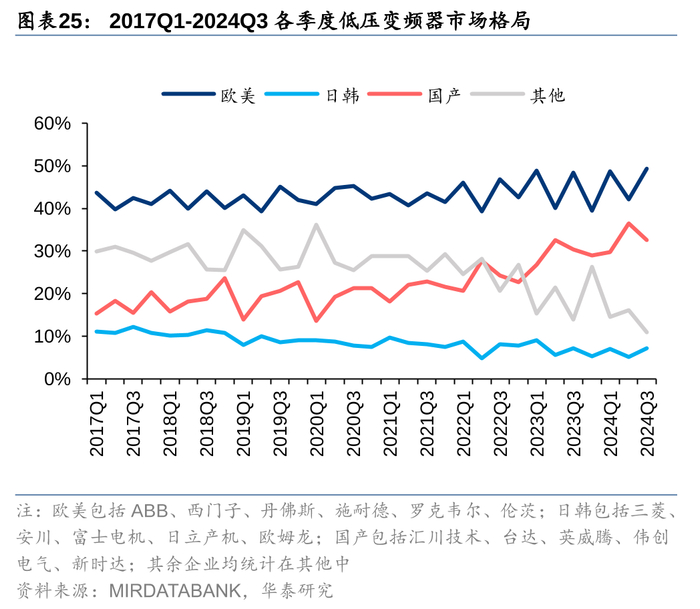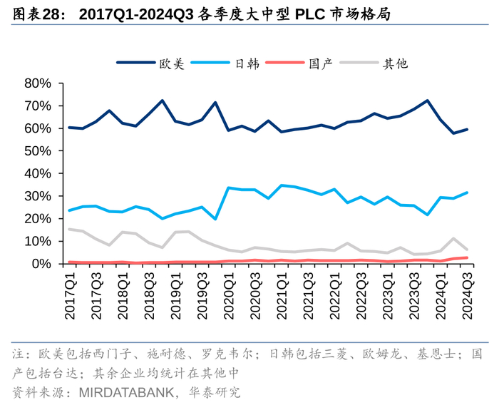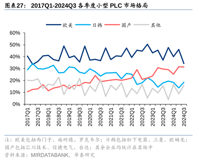 欧美系企业受到前期积累的高库存影响,工控业务业绩承压。为了应对国产企业持续发力后市场竞争加剧、维持市场份额,欧美系企业在今年进行了降价去库。从其报表数据可以发现,工控业务收入增速与盈利水平均同比下滑。根据西门子预测数据,其24Q3(FY24Q4)工控业务(Digital Industries、Smart Infrastructure板块)订单/收入分别为100.29/106.20亿欧元(同比-0.47%/-5.08%),利润率为15.61%(同比下滑3.93pct)。根据施耐德财报,其24Q1-3工控业务收入51.80亿欧元,同比-5.4%,其中亚洲地区同比-3.8%;Q3收入16.59亿欧元,同比-5.9%,其中亚洲地区同比-7.6%。根据罗克韦尔财报,其24Q3(FY24Q4)智能设备、软件与控制业务收入分别为9.46亿美元/38.04亿美元,同比-19%/-7%;利润率分别为20.6%/22.3%,同比-0.7/-11.2pct。