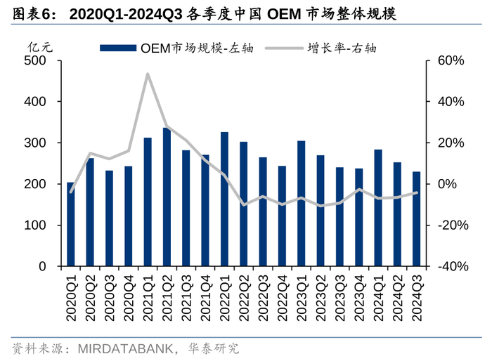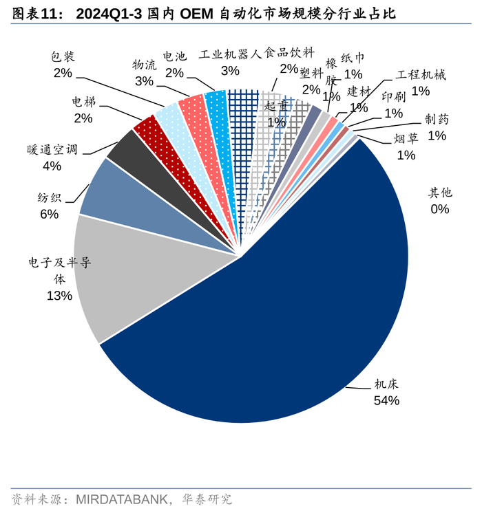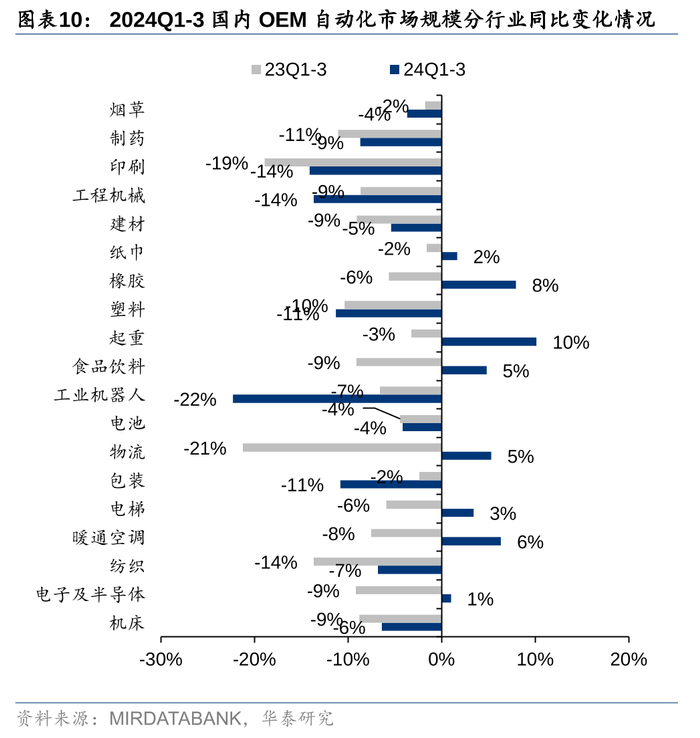 OEM市场中,在细分行业方面,24Q1-3纸巾、橡胶、起重、食品饮料、物流、电梯、暖通空调、电子及半导体行业实现同比正增长;印刷、工程机械、塑料、工业机器人、包装行业同比下滑超10%。占比最大的机床行业同比-6%。从绝对值来看,暖通空调行业增长的数额最大,机床行业下滑的数额最大。