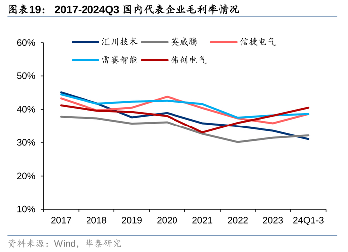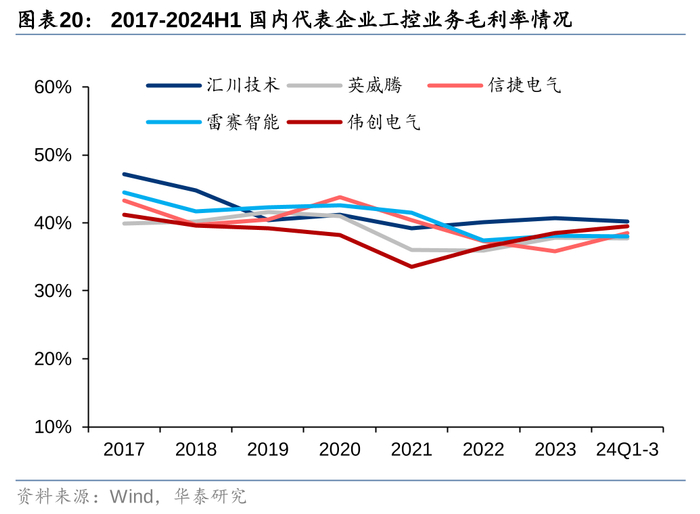 毛利率方面,较2023年,24H1国内代表上市企业基本略有下滑,部分企业实现结构性增长。其中,汇川技术、英威腾、雷赛智能24H1工控业务的毛利率较2023年下滑幅度小于0.4pct,受到锂电、光伏等新能源下游拖累。信捷电气、伟创电气24H1工控业务的毛利率较2023年分别提升2.68/0.98pct,信捷电气主要系产品结构变化,高毛利率的PLC产品占比提升,带动整体毛利率提升,伟创电气主要系海外收入增长较好,海外市场毛利率高于国内市场,带动整体毛利率提升。