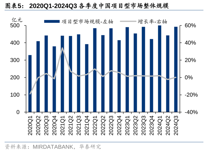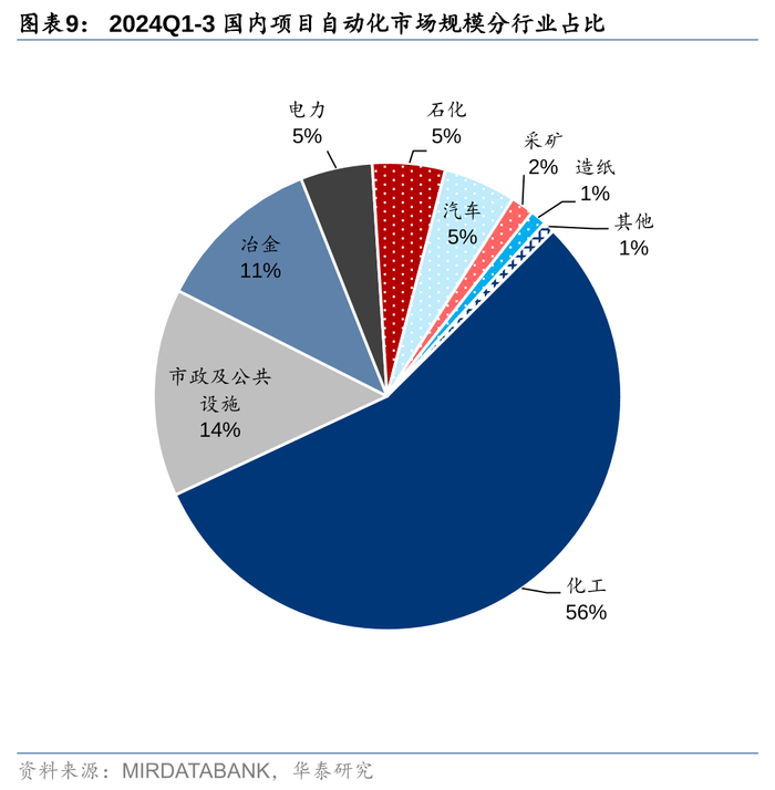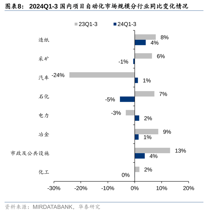 项目型市场中,在细分行业方面,24Q1-3造纸、汽车、电力、冶金、市政及公共设施行业实现同比正增长。占比最大的化工行业同比基本持平。从绝对值来看,市政及公共设施行业增长的数额最大,石化行业下滑的数额最大。