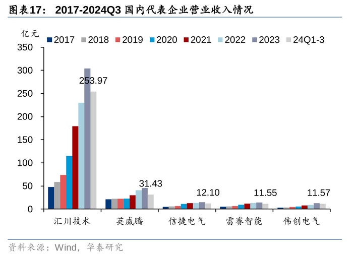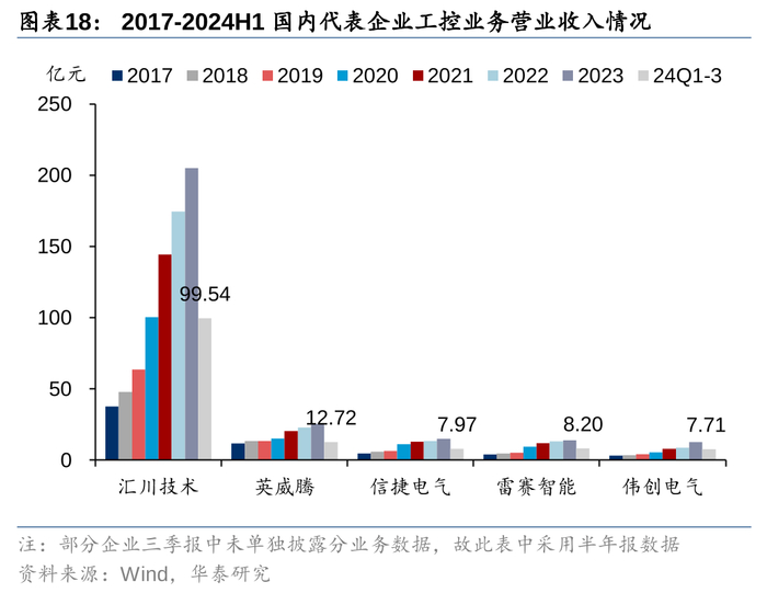 国内企业加大细分市场开拓力度,把握结构性增长机遇,代表上市企业收入增速好于行业表现。工控下游应用分散,细分市场众多,今年以来国产企业加大对于细分下游行业的重点突破,主推系统型解决方案,实现逆势增长。24H1汇川技术/英威腾/信捷电气/雷赛智能/伟创电气工控业务分别实现收入99.54亿元/12.72亿元/7.97亿元/8.20亿元/7.71亿元,同比+7.32%/+3.90%/+10.93%/+15.56%/+23.46%。