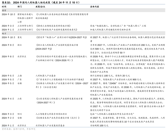 2024年国家和地方政策密集推出相关政策鼓励与推动人形机器人产业发展。继将人形机器人产业定调为“有望成为继计算机智能手机新能源汽车后的颠覆性产品”后,今年1月工信部在《关于推动未来产业创新发展的实施意见》中再次强调加速人形机器人等关键技术的突破和应用。地方层面,重庆、浙江、北京亦庄等地提出未来3-5年人形机器人产业的发展目标。值得关注的是北京、上海等多地设立人形机器人产业基金,有助于缓解企业融资压力,加速技术突破。我们看好政策对于行业发展形成积极引导作用。