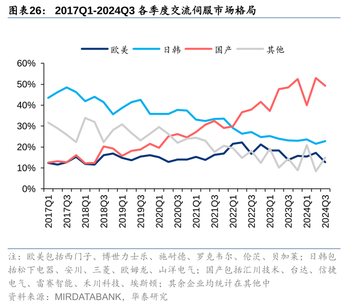 在国内工控市场,国产化替代正在推进中,份额提升态势明显。市场格局方面,对于低压变频器、交流伺服、小型PLC、大中型PLC产品,国内主要企业在国内市场的份额均呈现增长态势,24Q1-3的份额分别为32.89%/47.41%/29.52%/1.91%,较去年同期+2.91/+3.00/+1.41/+0.63pct。对于大中型PLC产品,仍有较大的国产化替代空间,但因为技术壁垒与稳定性等测试周期较长,替代周期也会较上述三种产品更长。