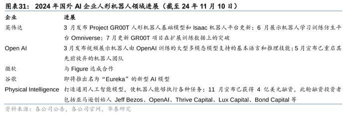 英伟达、OpenAI等加速AI算法性能提升。英伟达今年持续加强对于机器人全生态的布局,3月在2024年GTC大会上发布了人形机器人基础模型Project GR00T,通过GPU加速仿真模拟将昂贵的数据扩展至海量数据,缩短数据训练时间。5月OpenAI宣布已重启其先前放弃的机器人团队,我们推测或主要系人形机器人产业较此前迎来新的发展阶段,缺乏训练数据的问题已得到较好改进;后续建议关注其GPT-5的发布情况。AI端突破决定了人形机器人的性能上限,英伟达、OpenAI等科技巨头企业发力有望推动人形机器人产业发展驶入快车道。