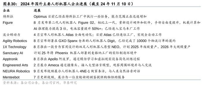 除特斯拉外,海外多个企业也在今年积极推出新一代产品、推进终端应用。4月波士顿动力宣布放弃液压驱动方案,采取其他企业主流的电驱动方案,从而实现了更平滑、更静音的运动性能,也正在工厂工作运行中。8月Figure发布第二代人形机器人产品,在硬件和软件维度均有提升,包括视觉、续航、算法、手部灵活度等多个方面,后续表现值得关注。应用端多数仍以工厂场景为主,与宝马、奔驰、亚马逊等展开合作。