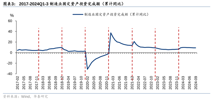 24Q1-3我国制造业固定资产投资完成额累计同比增速提升。24Q1-3我国制造业固定资产投资完成额同比+9.2%,好于去年同期(23Q1-3为6.2%),且较今年1-8月的9.1%略有提升。分行业来看,食品制造业、有色金属冶炼及压延加工业、铁路船舶航空航天和其他运输设备制造业的累计同比增速较高,均超过20%。