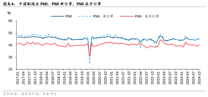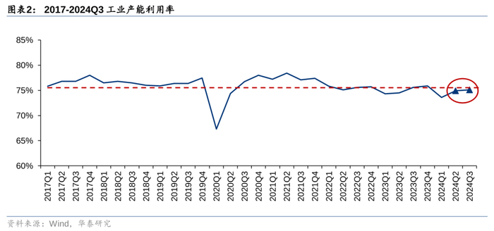 工业产能利用率环比向好,24Q2、Q3连续两个季度回升。从工业产能利用率来看,24Q2、Q3连续2个季度回升。24Q3纺织业、化学原料和化学制品制造业、医药制造业、化学纤维制造业、计算机通信和其他电子设备制造业同比实现增长。整体来看,当前工业产能利用率仍处于历史相对低位,有待需求端扩张与供给端收缩拉动上行。