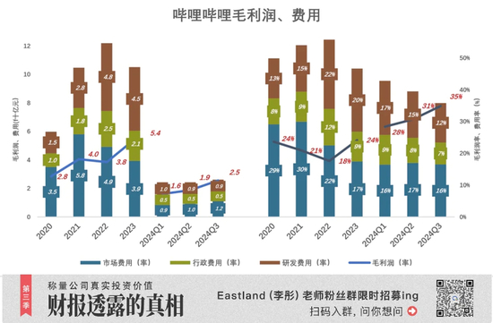 2023年,B站调整了策略,总费用回到2021年水平,费用率46.6%(远低于2021年),毛利润率则回升到24.2%;