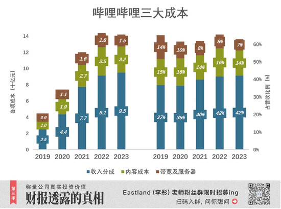 服务器/带宽成本于2022年达到峰值18亿;2023年回落到15亿、占营收的6.6%,比2019年低7个百分点。
