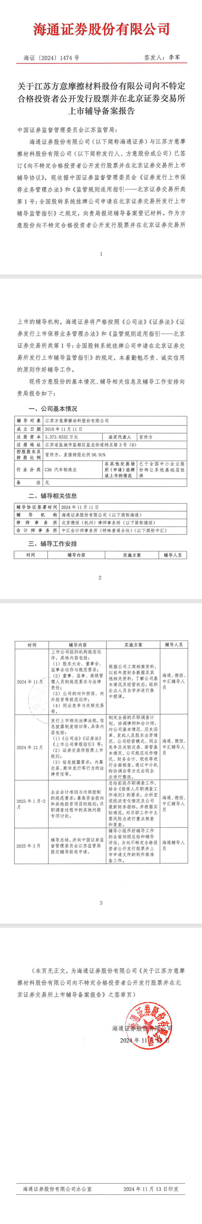 江苏证监局:江苏方意摩擦材料股份有限公司辅导备案报告,保荐机构:海通证券股份有限公司