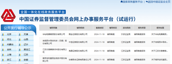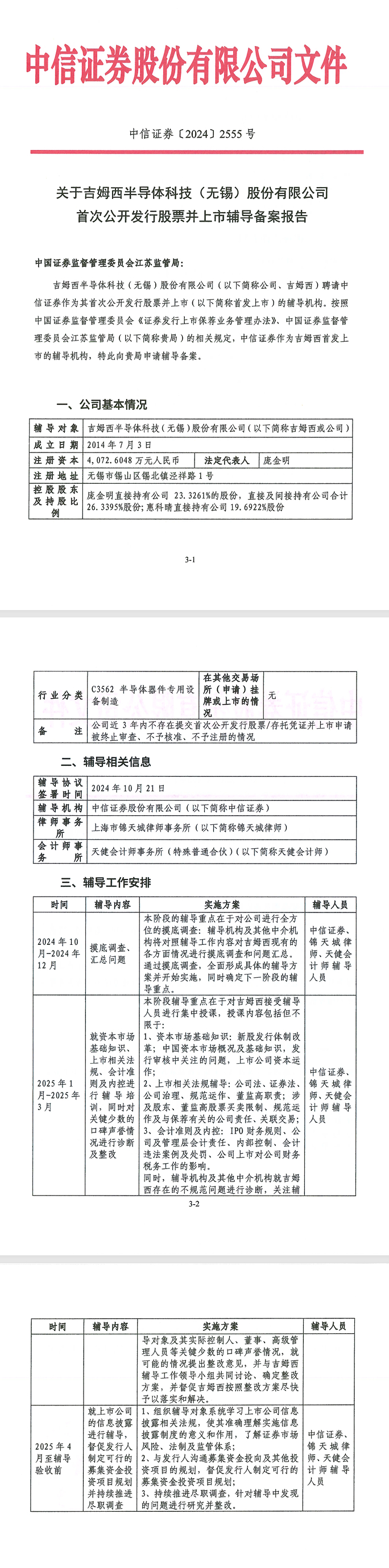 江苏证监局:吉姆西半导体科技(无锡)股份有限公司辅导备案报告,保荐机构:中信证券股份有限公司
