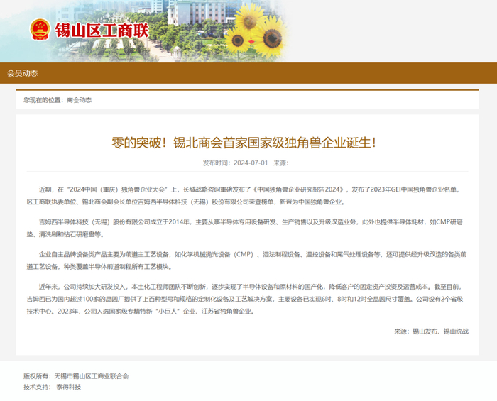 近期,在“2024中国(重庆)独角兽企业大会”上,长城战略咨询重磅发布了《中国独角兽企业研究报告2024》,发布了2023年GEI中国独角兽企业名单,区工商联执委单位、锡北商会副会长单位吉姆西半导体科技(无锡)股份有限公司荣登榜单,新晋为中国独角兽企业。