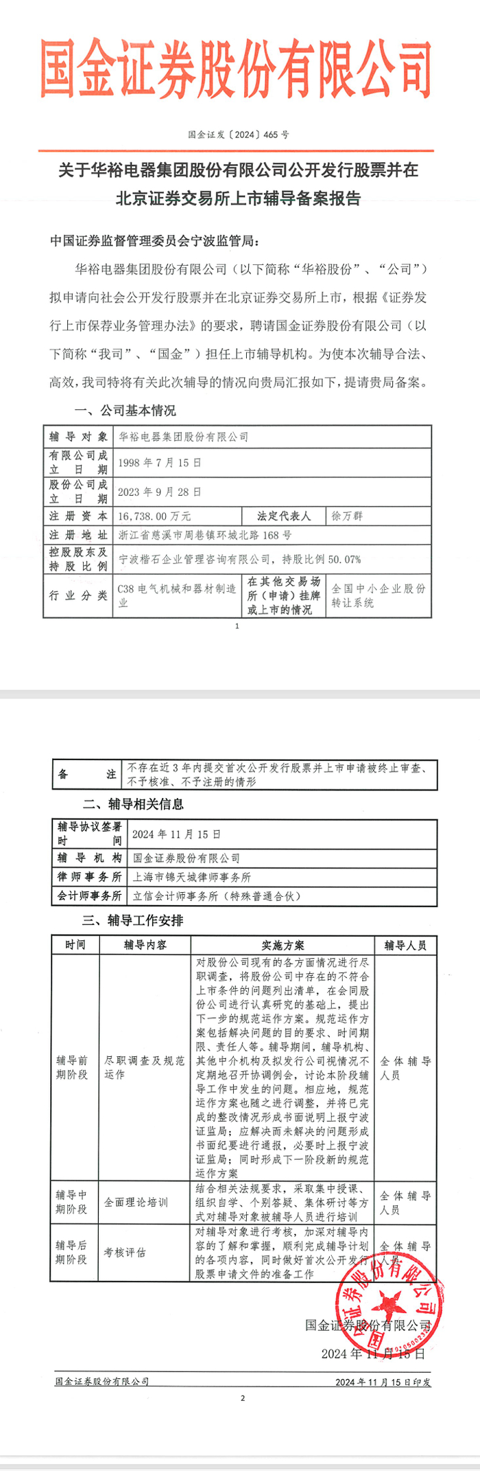 宁波证监局:华裕电器集团股份有限公司辅导备案报告,保荐机构:国金证券股份有限公司