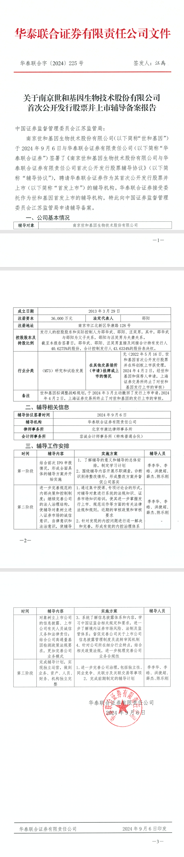 江苏证监局:南京世和基因生物技术股份有限公司辅导备案报告,保荐机构:华泰联合证券有限责任公司