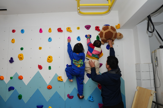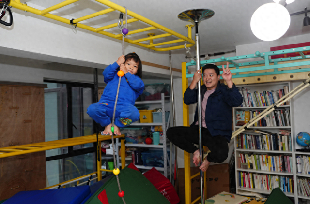 在小茉莉父亲吴盛城的指导下,波妞熟练地爬上攀爬架,期间,小茉莉也会和波妞一起运动。看着小朋友们玩得开始,吴盛城也忍不住加入她们,“来,我们一起爬。”