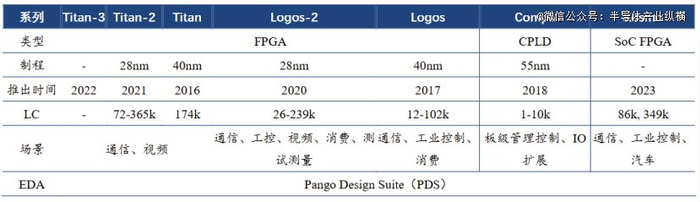 紫光同创的FPGA产品主要分为3大系列:Titan、Logos和Compa系列。