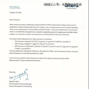 近日,Altera宣布为应对市场压力和运营成本上涨,将对部分FPGA产品系列价格进行调整,新价格将于2024年11月24日生效。此次调整旨在确保Altera能够持续提供可靠的产品供应,并保持其强大的FPGA解决方案组合,以支持客户需求。