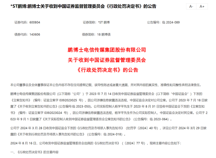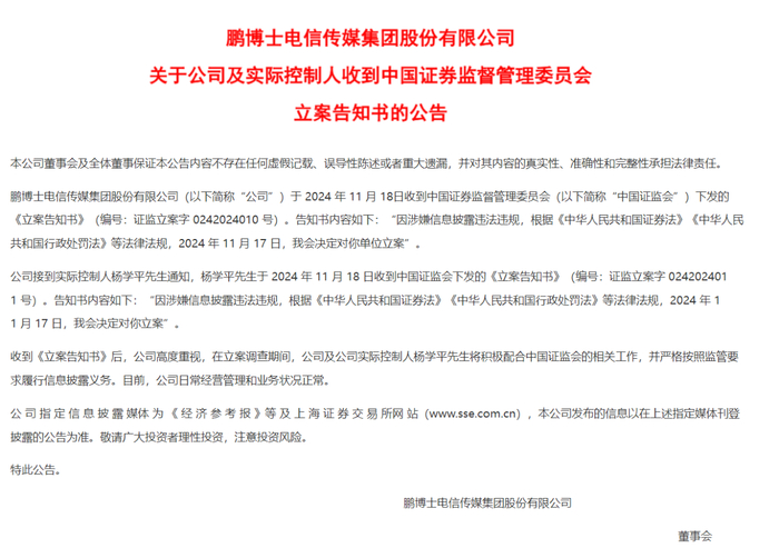 *ST鹏博在公告中披露,公司及实际控制人杨学平于2024年11月17日分别收到中国证监会的立案告知书。此次立案调查主要涉及公司2023年度业绩预告不准确、未履行信息披露义务等多项问题。具体违规行为包括业绩预告与实际情况大幅偏差、设立全资孙公司和参股公司未及时披露信息、子公司出售事项未履行披露义务等。