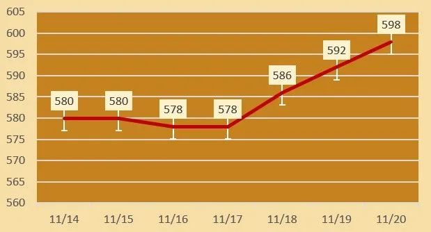 今日黄金回收价格每克598元,铂金回收价格每克200元,钯金回收价格每克206元,18K金回收价格每克426元,白银回收价格每克5元。(黄金行情是波动的,以结算价格为准。)
