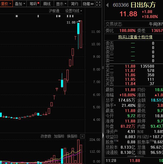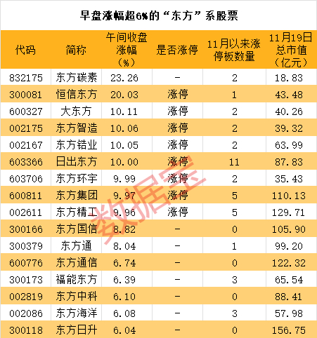 日出东方是市场炒作“东方”系的引爆点,该股11月以来已11个涨停板(含早盘),早盘上演“地天板”,引爆资金炒作热情。