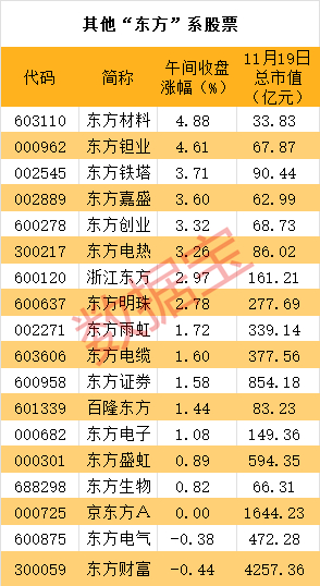 据数据宝统计,A股中,带有“东方”字样的个股共计34只,早盘下跌的仅有东方电气、东方财富两只大盘股,其他个股悉数上涨。