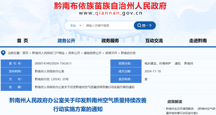 黔南州空气质量持续改善行动实施方案