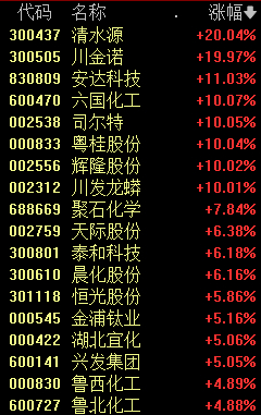 今天上午,化工股集体走强,丙烯酸、磷化工、化肥等板块涨幅居前,清水源(300437)、川金诺(300505)等个股大涨。