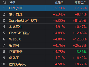 板块方面,医疗信息化、Sora概念、磷化工、游戏等板块涨幅居前,银行等少数板块下跌。