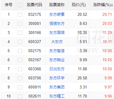 同花顺数据显示,截至收盘,全市场34只“东方系”股票,32只飘红,10只涨停或涨幅超10%。