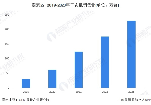 2019-2023年,中国干衣机销量在“宅经济”的推动下快速增长,中国干衣机销量从2019年的30万台增长至2023年的230万台,中国干衣机产品需求仍保持快速的增长。