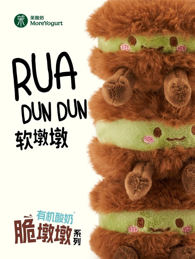 不仅如此,玩偶周边的风也是刮到了现制酸奶,茉酸奶爱好者们马上也能拥有自己专属萌趣周边啦。除了三款美味的有机酸奶脆墩墩,茉酸奶还为广大消费者们准备了特别的惊喜——软墩墩。软墩墩的上半部分呈现温暖的棕色,内馅则是清新的抹茶色。与脆硬的原版食物不同,软墩墩的外层被设计成柔软的毛绒质感,底部还有两条小短腿,搭配内馅上的可爱小表情,简直萌态十足。活动期间,购买指定脆墩墩套餐,就能获得限量软墩墩周边。