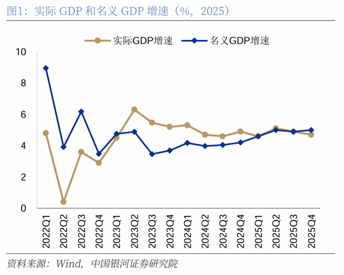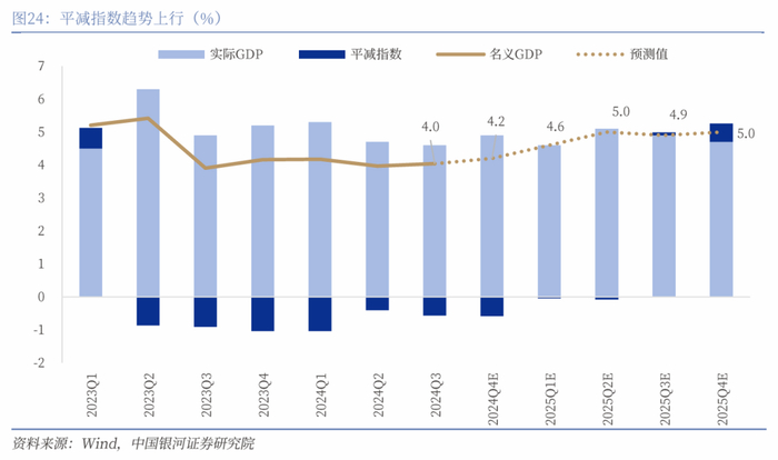 结合我们对CPI和PPI的预测,我们认为GDP平减指数将呈小幅回升态势,Q1-Q4分别为0%、-0.1%、0.1%和0.6%,全年平减指数为0.1%。伴随物价的温和回升,名义GDP和实际GDP之间的背离将显著收敛。我们预计2025年名义GDP增速为4.9%,Q1-Q4分别为4.6%、5%、4.9%和5%,总体呈现先回升后平稳的趋势。