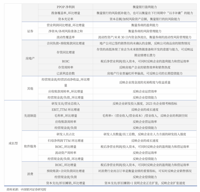 成长型行业则应突出其成长属性,对于先进制造和软件服务行业,企业增长点来自于科技创新,因此我们加入了成长能力和研发投入的指标;对于消费行业增长点则来自于企业扩张、销售增长与市占率的提高,因此我们用预收账款+合同负债增速反映销售情况,用资本支出/折旧摊销反映企业扩张。
