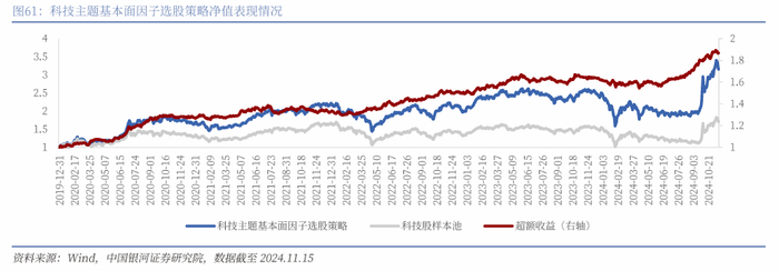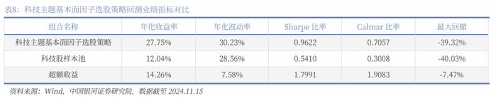 2019年12月31日至2024年11月15日,科技主题基本面因子选股策略回测净值的年化收益率为27.75%,相比科技股样本池实现年化超额收益14.26%;策略Sharpe比率和Calmar比率分别为0.9622、0.7057,策略超额收益的Sharpe比率和Calmar比率分别为1.7991、1.9083,表明基本面因子选股在科技股票池中可获得稳健的超额收益。