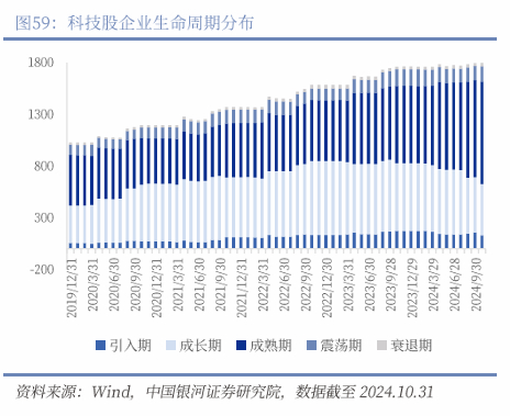 科技股企业生命周期分布如下。划分结果显示,在A股科技股中,绝大部分为成长期和成熟期的股票;近期成熟期股票数量显著增加,截至2024年10月31日,引入期、成长期、成熟期、震荡期、衰退期的科技股数量分别为130、497、990、148、32只。对于单个股票,企业生命周期划分的结果在长期具有稳定性;成熟期的股票相对于所有科技股平均水平有较为稳定的超额收益。因此,我们将重点从股票数量较多的成长期和成熟期中进行选股。
