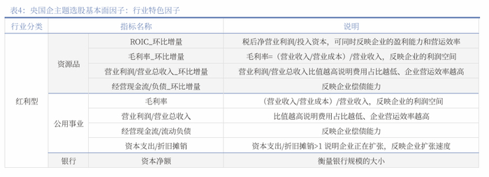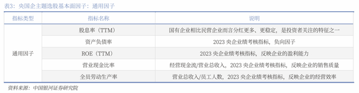 基本面因子具有共性和个性,可分为通用因子和行业特色因子。“共性”意味着所有行业都关心的指标,反映在央国企中可表现为“一利五率”央企业绩考核指标,它对所有行业的央企均有明确要求。我们从中选择净资产收益率ROE(TTM)、营业现金比率、全员劳动生产率、资产负债率等作为国企选股的通用因子;同时国企相比于民企的重要特征之一是分红较多,因此我们将股息率也纳入通用因子中。