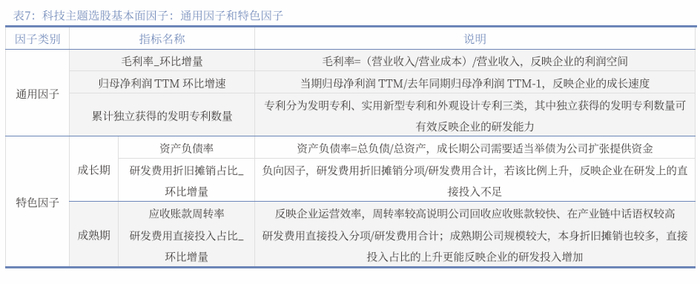 和央国企根据所属行业选择基本面因子的方法类似,科技股的选股因子同样分为通用因子和特色因子。对于通用因子,我们从科技股最重要的盈利、成长与研发能力进行考量,选择了毛利率_环比增量、归母净利润环比增速与累计独立获得的发明专利数量3个因子。