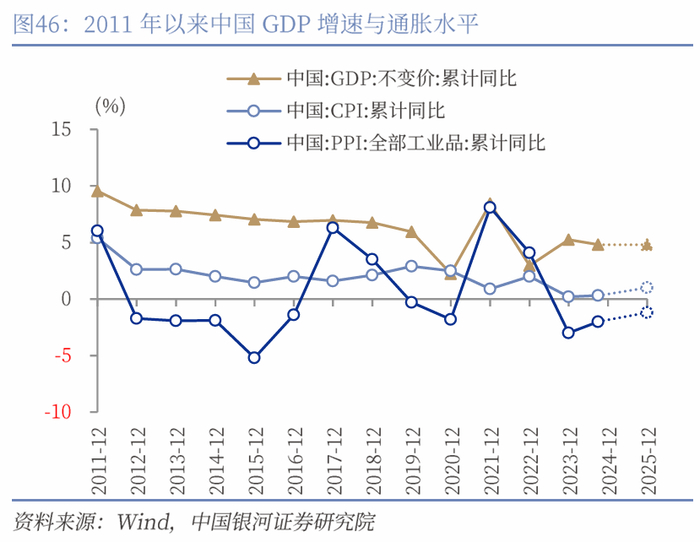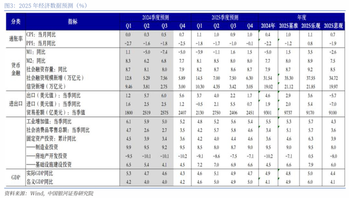 2025年全球经济面临的不确定性将显著提升,客观上也使得明年国内经济增长的波动区间放大,因此在上述基准假设情景的基础上,我们也设置了以下乐观情况和悲观情况,实际GDP增速范围为4.4%~5.0%。