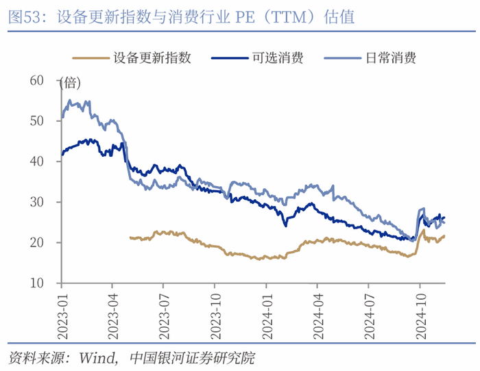 从估值来看,截至11月13日,设备更新指数的PE估值为21.65倍,处于有史以来(2023年5月4日至今)88.95%分位数水平,估值水平相对较高。可选消费、日常消费的PE估值分别为26.19倍、24.92倍,处于2010年以来中低水平。