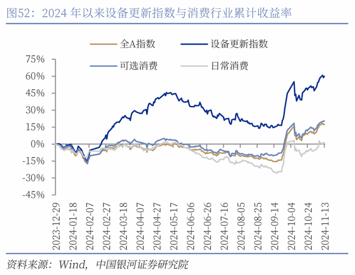 2024年以来,国务院大力推动各个领域的设备更新以及消费品以旧换新工作。从业绩来看,2024年三季报设备更新指数归母净利润同比增长17.17%,可选消费、日常消费增速分别为1.40%、36.48%,均高于全部A股-0.57%的增速,表明大规模设备更新和消费品以旧换新方案实施效果较为显著。