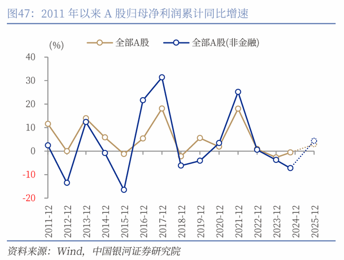 2025年逆周期政策加速落地,经济基本面趋于改善,有望带动A股盈利增速好转。基于宏观团队判断,2025年实际GDP增速预测值为4.8%,CPI同比预测值为1.0%,PPI同比预测值为-1.2%,根据A股盈利增速与GDP实际增速和通胀的关系,预测2025年全部A股归母净利润同比增速为2.9%,预测全部A股(非金融)归母净利润同比增速为4.3%。