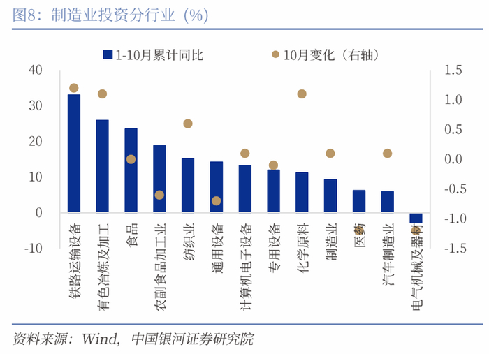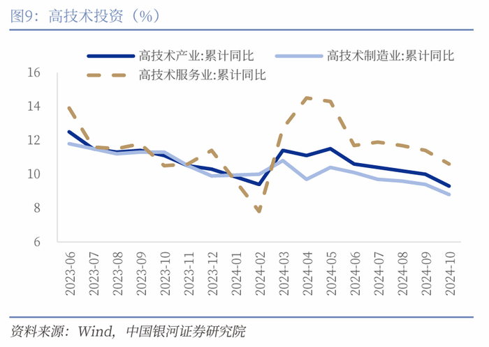 一是高端制造以及制造业转型升级,仍将持续引领投资增速。自2023年总书记提出新质生产力以来,重要一点就是培育未来产业、壮大战略性新兴产业。2024年10月经济数据显示高技术产业投资同比增长9.3%,其中高技术制造业和高技术服务业投资分别增长8.8%、10.6%。高技术产业主要带动制造业投资。2024年10月工信部新闻发布会提到要深入实施制造业重大技术改造升级;加快推进重点产业链高质量发展行动、国家科技重大专项和国家重点研发计划等;培育壮大低空经济、商业航天、生物制造等新产业新赛道。结合此前工信部发布的《通用航空装备创新应用实施方案(2024-2030年)》,提出到2027年,我国通用航空装备供给能力和产业创新能力将显著提升。以及《“十四五”生物经济发展规划》明确提出,到2025年,生物经济成为推动高质量发展的强劲动力,经济增加值占国内生产总值的比重稳步提升。预计2025年新产业新业态领域的投资会是制造业投资的重要一环。
