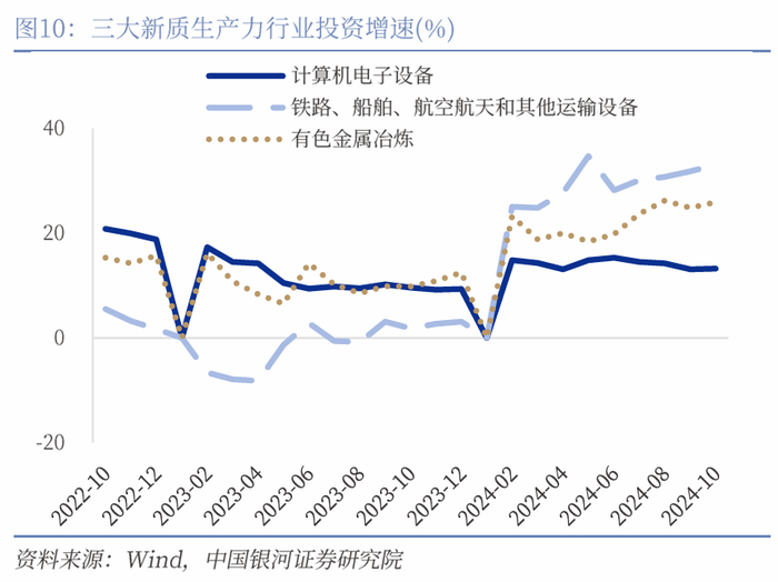 二是坚定经济转型战略定力,新质生产力加快形成。我们认为结合二十届三中全会坚定改革的战略要求,2025年新质生产力相关制造业增速仍将维持高位。2024年1-10月,装备制造业增加值同比增长6.6%,高技术制造业增加值增长9.4%,分别快于全部规模以上工业增加值1.3和4.1个百分点。新质生产力是实现中国式现代化和高质量发展的迫切要求,是我国产业升级和经济转型的重要抓手。因此预计2025年新质生产力相关产业仍将有力带动工业经济发展,计算机电子设备、铁路船舶航空航天运输设备、有色金属冶炼等行业增速预计仍会较快。